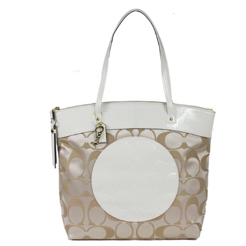 !9#Coach Julia Signature Laura Shopper Bag Purse Tote 18835 Khaki White